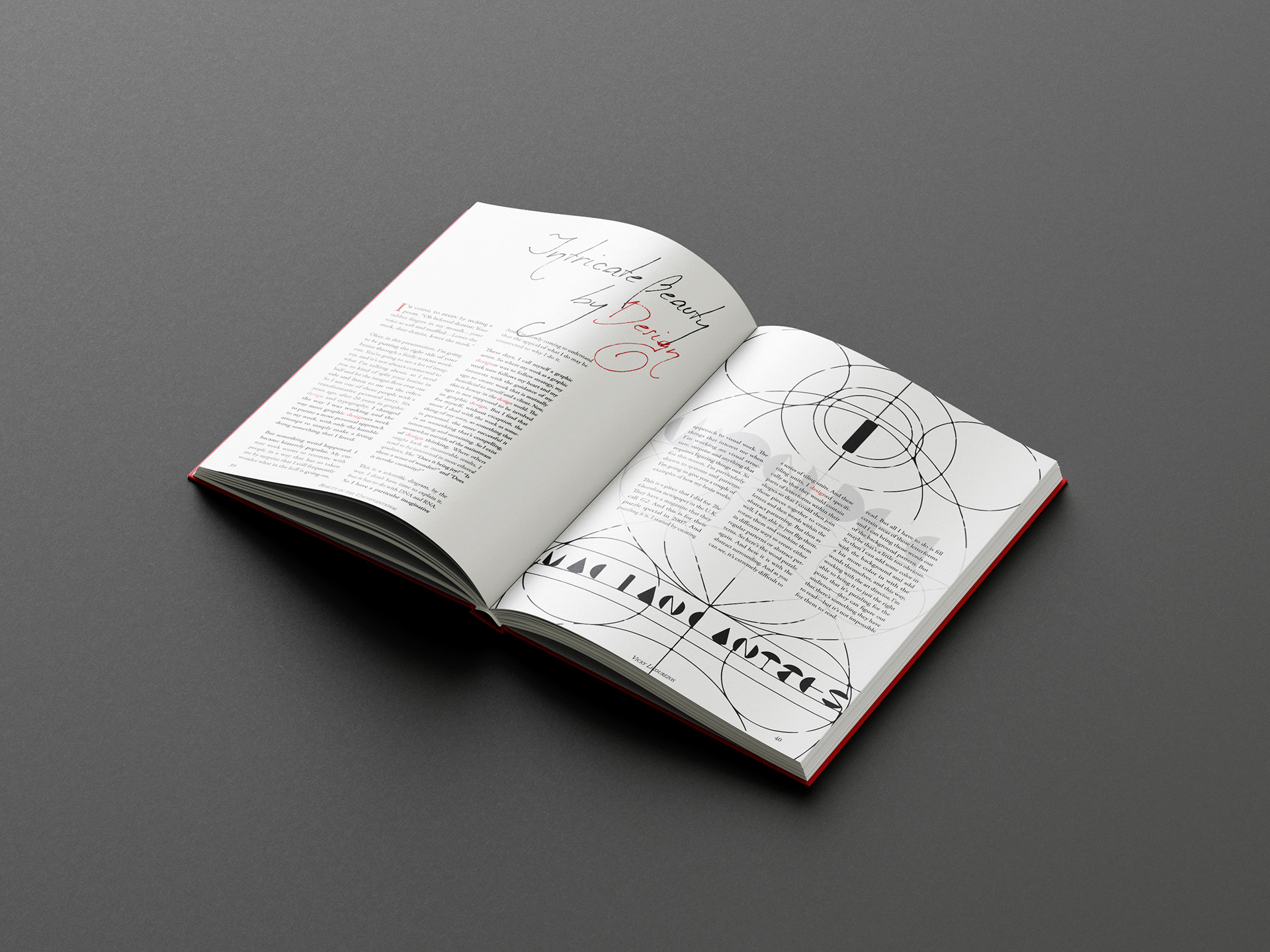 The first text is a selection from Bruno Munari’s book “Design as Art.” For the secondary text, I chose Marian Bantjes’s TED Talk “Intricate Beauty by Design.” In it, she shares how she identifies as a graphic artist rather than a designer, creating from heart and ego, experimenting with materials and techniques, and embracing the unconventional. Unlike conventional graphic design, her work is creative and intricate. While Munari explores the role of design in everyday life, Bantjes pushes the boundaries of convention, her intricate, deeply personal work showing that design can be both meaningful and wildly unconventional. The final result of this book weaves their voices together visually, highlighting their shared belief that design is both personal and unconventional.